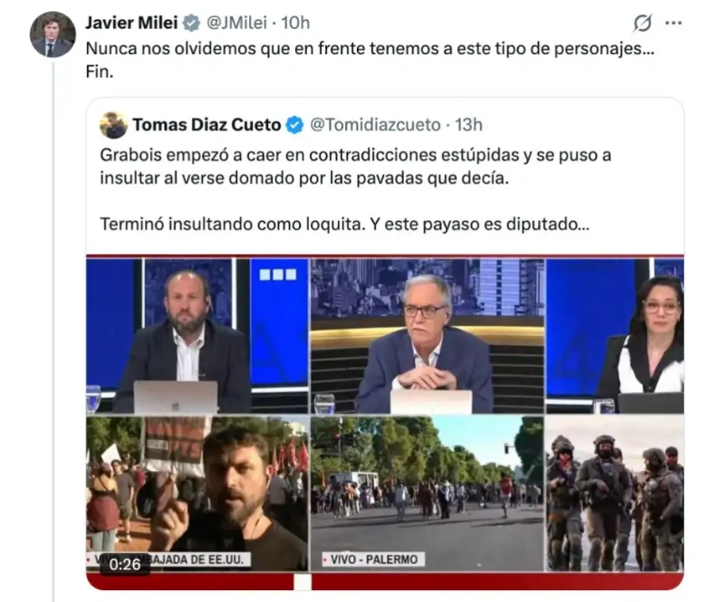 El fragmento del cruce televisivo entre Grabois y el equipo de A24 comenzó a circular con fuerza en redes sociales y llegó = al presidente Javier Milei. Durante la noche, el mandatario citó el video en su cuenta y escribió: "Nunca nos olvidemos que enfrente tenemos a este tipo de personajes... Fin".