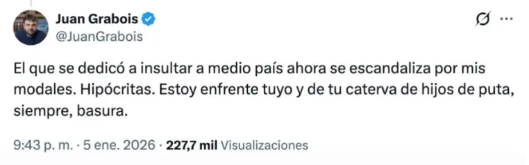 La respuesta de Grabois no tardó en llegar. Poco más de media hora después, el diputado reaccionó y publicó. "El que se dedicó a insultar a medio país ahora se escandaliza por mis modales. Hipócritas. Estoy enfrente tuyo y de tu caterva de hijos de puta, siempre, basura".