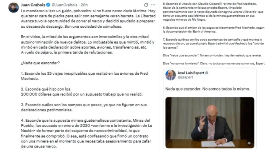 En un posteo realizado el viernes en su cuenta oficial de X,Grabois también había apuntado contra Espert, cuestionando el descargo del diputado libertario. El texto arranca diciendo: "Lo mandaron a leer un guion, pobrecito: si no fuera narco daría lástima. Hay que tener cara de piedra para salir con semejante verso berreta. La Libertad Avanza tuvo la oportunidad de correr al narco y decidió ayudarlo a preparar su descarado descargo. Son una sociedad de cómplices".