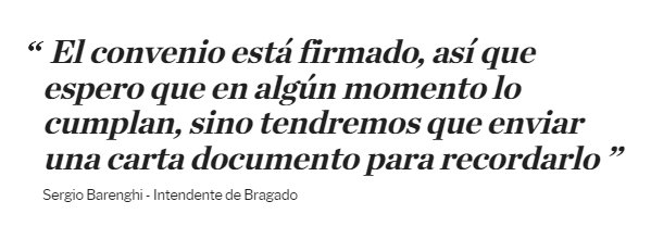 Frente a eso, el jefe comunal de Bragado analiza iniciar acciones legales en caso de que no lleguen los recursos. "El convenio está firmado, así que espero que en algún momento lo cumplan, sino tendremos que enviar una carta documento para recordarlo", agregó.
