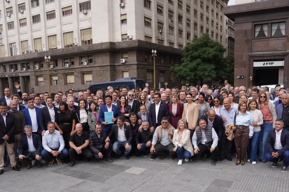 Este lunes, un masivo grupo de intendentes de la provincia de Buenos Aires, pero también de varias provincias del país, marcharon a la sede del Ministerio de Economía y entregaron un documento para reclamarle a Caputo por los fondos que la Nación les recortó a las provincias -y por goteo a ellos- en materia de coparticipación, como así también por la reactivación de la obra pública y vial a partir del cobro del impuesto a los combustibles.