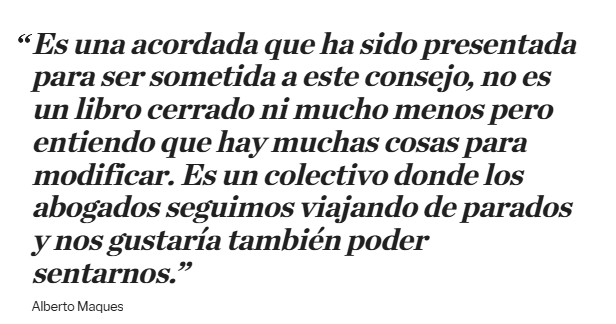 En la misma sintonía, el consejero Maques objetó este miércoles la premura de Rosenkrantz y Lorenzetti. "Es una acordada que ha sido presentada para ser sometida a este consejo, no es un libro cerrado ni mucho menos", afirmó y agregó: "es un colectivo donde los abogados seguimos viajando de parados y nos gustaría también poder sentarnos".