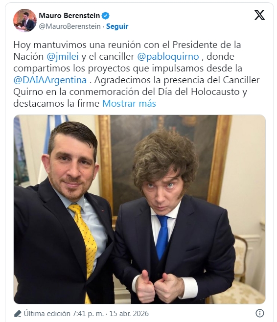 A través de la red social X, Berenstein valoró el encuentro junto al mandatario y el canciller Pablo Quirno: "Hoy mantuvimos una reunión donde compartimos los proyectos que impulsamos desde la DAIA". En este sentido, el dirigente destacó la gestión oficial: "Agradecimos la presencia del canciller en la conmemoración del Día del Holocausto y resaltamos la firme e inclaudicable postura del Gobierno en apoyo al Estado de Israel".