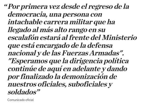 El comunicado del gobierno destaca que "por primera vez desde el regreso de la democracia, una persona con intachable carrera militar que ha llegado al más alto rango en su escalafón estará al frente del Ministerio que está encargado de la defensa nacional y de las Fuerzas Armadas". "Esperamos que la dirigencia política continúe de aquí en adelante y dando por finalizado la demonización de nuestros oficiales, suboficiales y soldados", continúa.