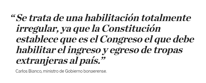 "Se trata de una habilitación totalmente irregular, ya que la Constitución establece que es el Congreso el que debe habilitar el ingreso y egreso de tropas extranjeras al país", dijo Bianco durante una conferencia de prensa brindada este lunes en La Plata.