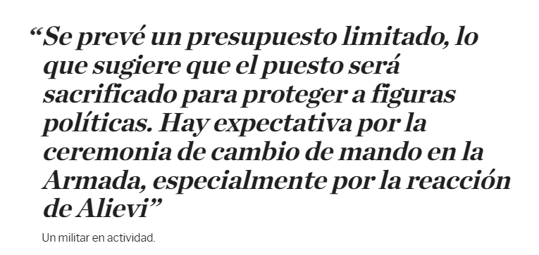 "Se prevé un presupuesto limitado, lo que sugiere que el puesto será sacrificado para proteger a figuras políticas. Hay expectativa por la ceremonia de cambio de mando en la Armada, especialmente por la reacción de Alievi", anticipan.
