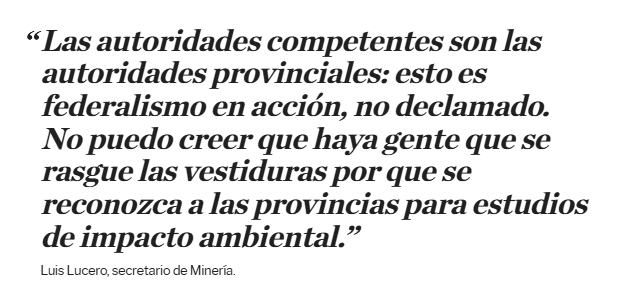 En ese sentido, consideró que "las autoridades competentes son las autoridades provinciales: esto es federalismo en acción, no declamado". "No puedo creer que haya gente que se rasgue las vestiduras por que se reconozca a las provincias para estudios de impacto ambiental", argumentó en referencia a la autonomía que el proyecto le otorga a las provincias por encima del IANIGLA.