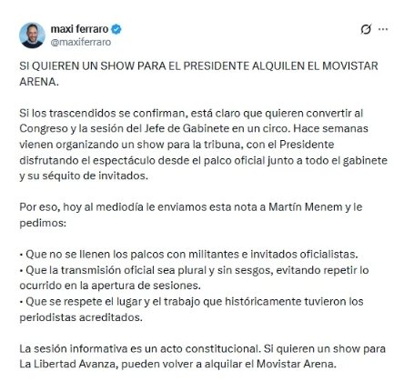 Ferraro sumó otro reclamo vinculado al trabajo de la prensa parlamentaria. El diputado pidió que no se repita el desplazamiento de periodistas acreditados desde sus palcos habituales hacia sectores laterales, como ocurrió en sesiones anteriores.