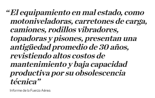 "A pesar de ser responsable de construir, reparar y mantener las 25 pistas (3.750.000 m2) y 15 helipuertos (29.452 m2) en todo el país, el Grupo Construcciones (GC) no cuenta con los medios adecuados para llevar a cabo estas tareas de manera eficiente, lo que impacta directamente en las operaciones de la Fuerza Aérea", continúa.
