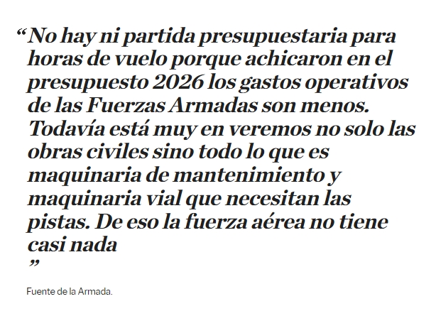 Un militar de la fuerza aérea dijo a LPO que "no hay ni partida presupuestaria para horas de vuelo porque achicaron en el presupuesto 2026 los gastos operativos de las Fuerzas Armadas son menos. Todavía está muy en veremos no solo las obras civiles sino todo lo que es maquinaria de mantenimiento y maquinaria vial que necesitan las pistas. De eso la fuerza aérea no tiene casi nada".