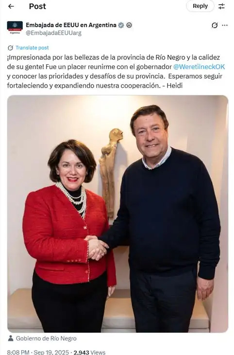 La adhesión de Argentina al programa FIRST, el pasado 22 de septiembre, se anunció con entusiasmo desde la Embajada de EE.UU. en Buenos Aires y fue acompañada por visitas estratégicas, como la de Heidi Gómez Rápalo a Bariloche. La representante estadounidense, que oficia de embajadora interina hasta que llegue Peter Lamelas, recorrió el Instituto Balseiro, el INVAP y se reunió con el embajador rionegrino, Alberto Weretilneck, días antes