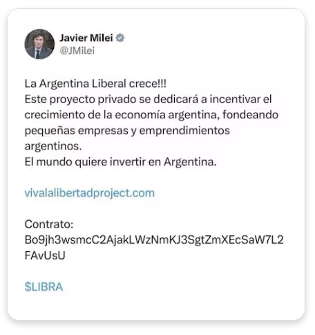Milei promocionó en X la criptomoneda $LIBRA, que se desplomó horas después generando pérdidas millonarias a más de 44.000 inversores.