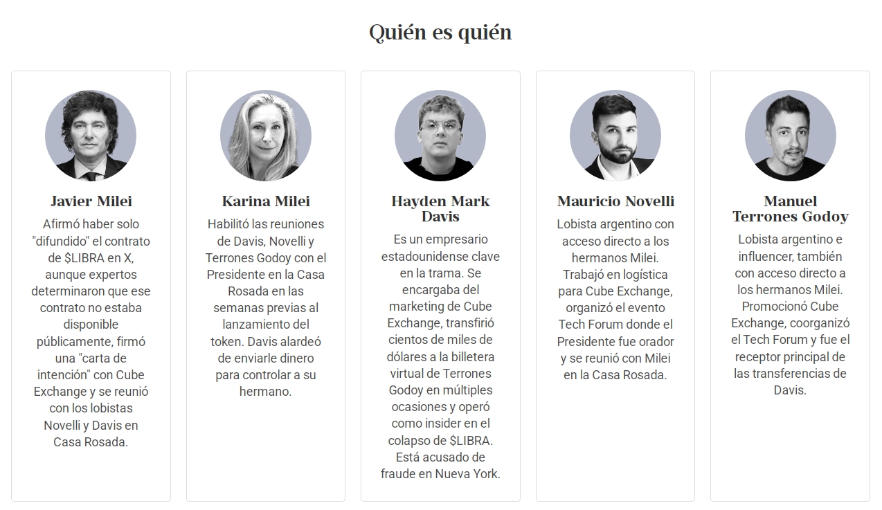 Cube Exchange también auspició Tech Forum, el evento que en octubre de 2024 organizaron Novelli y Terrones Godoy, con Milei como orador central. El foro levantó suspicacias y ruidos. El fundador y CEO de Cardano, Charles Hoskinson, denunció la forma en que Novelli y Terrones Godoy le pidieron que patrocinara el evento. "Nos decían: 'Hey, danos algo'", relató mientras hacía el gesto de contar billetes con los dedos frente a la cámara. "'Podemos hacer una reunión [con Milei], y, oh, sí, cosas mágicas pueden suceder'", reprodujo.