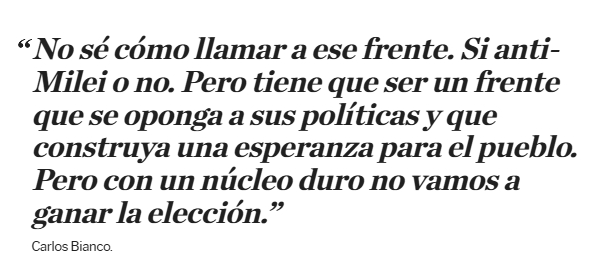 Esta mañana, Carlos Bianco salió a responderle. "No sé cómo llamar a ese frente. Si anti-Milei o no. Pero tiene que ser un frente que se oponga a sus políticas y que construya una esperanza para el pueblo", dijo y remarcó que por una cuestión de aritmética electoral el peronismo no puede aspirar a ganar sin ampliar su base de alianzas. "Con un núcleo duro no vamos a ganar la elección", planteó.