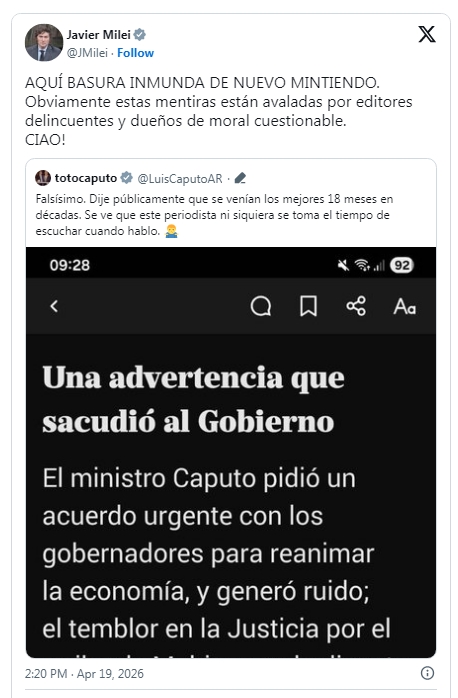 Javier Milei escaló otro peldaño su pelea con el diario La Nación. Este domingo aprovechó un tuit de Toto Caputo contra una nota del columnista político Jorge Liotti, para insultar al editor y propietario del diario, Fernán Saguier.