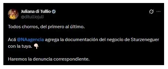 La senadora Juliana di Tullio, referente del interbloque de Unión por la Patria, adelantó que legisladores del espacio presentarán una denuncia tras la difusión de la contratación. A través de sus redes sociales, la legisladora cuestionó con dureza el vínculo entre el ministro y la entidad adjudicataria y afirmó que impulsarán acciones formales.