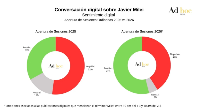 Según relevó Ad Hoc, de Javier Correa, "la apertura de sesiones ordinarias de este año generó el menor volumen de menciones digitales al Presidente en comparación a las dos anteriores". La escalerita descendente es llamativa no solo por lo que se convirtió en la confirmación de una tendencia sino porque, además, las menciones a Milei ya no aparecen espontáneas, siguiendo un interés orgánico de la comunidad digital, sino fogoneadas por usuarios que integran el ecosistema de posteos pagos del oficialismo.