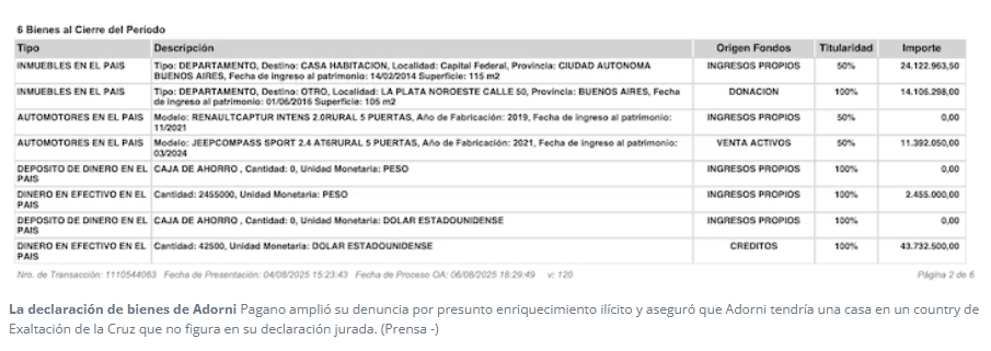 En los papeles oficiales, el mapa es otro. La última declaración jurada de Adorni consigna dos inmuebles: un departamento en Parque Chacabuco -compartido con su esposa- y otro en La Plata, recibido como donación familiar. También declara ahorros por unos 50.000 dólares y deudas por alrededor de 90.000. Nada sobre una casa en un country con golf, canchas y caballerizas.