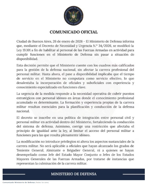 El Gobierno de Javier Milei envió un nuevo guiño a la familia militar. Este lunes, a través de la publicación del DNU 34/2026 en el Boletín Oficial, la administración ultraderechista modificó la Ley 19.101, con el objetivo de habilitar al personal de las Fuerzas Armadas en actividad a cumplir funciones en el Ministerio de Defensa sin pasar a situación de disponibilidad.