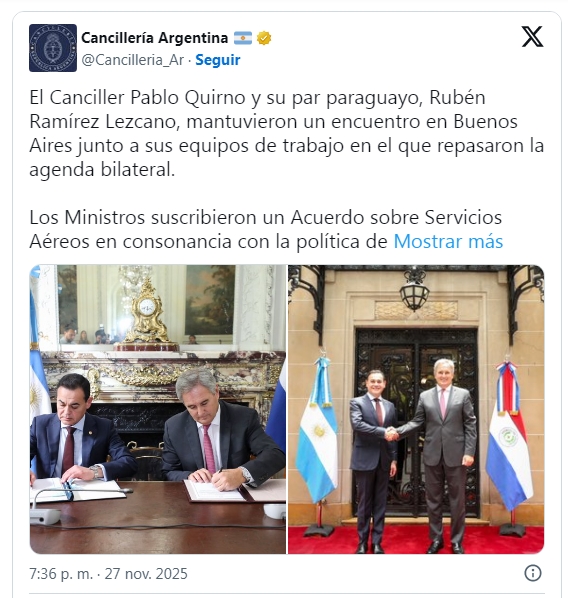 El canciller Pablo Quirno y su par paraguayo, Rubén Ramírez Lezcano, mantuvieron este jueves un encuentro en Buenos Aires donde repasaron los principales temas de la agenda bilateral, en un contexto de renovado entendimiento político, y firmaron un Acuerdo sobre Servicios Aéreos.