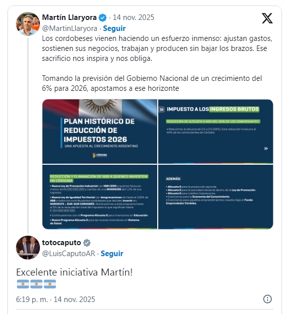 El paquete no pasó desapercibido en los cuarteles libertarios. Luis Caputo felicitó públicamente a Llaryora. "Excelente iniciativa Martín!", escribió el titular de Hacienda en un tuit, dejando atrás los enfrentamientos recientes, azuzados por la coyuntura electoral.
