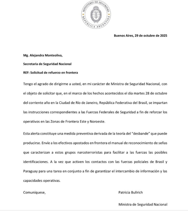 En la nota de Bullrich a Monteoliva se destaca la frase de que "esta alerta constituye una medida preventiva derivada de la teoría del desbande que puede producirse". Se trata de un mensaje de publicidad para apoyar al gobernador bolsonarista de Río, como si la operación hubiera sido un gran éxito. En realidad, el gobernador Claudio Castro se jugó a hacer un acto de campaña, mal preparado, sin ayuda de las fuerzas federales, lo que derivó en una matanza y en que no pudieran capturar a los líderes del CV. El gobernador quiere ser senador y la campaña electoral de 2026 está lanzada: ya saben que Lula irá por un nuevo mandato.