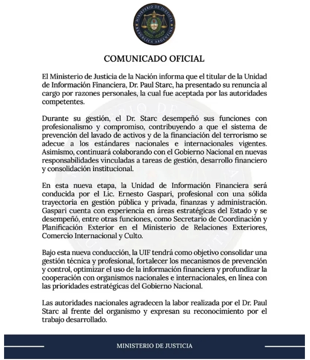 La salida de Starc se concreta a menos de un año de haber asumido al frente del organismo clave en la prevención del lavado de activos y la financiación del terrorismo, y se suma a una serie de cambios recientes dentro de la administración nacional.