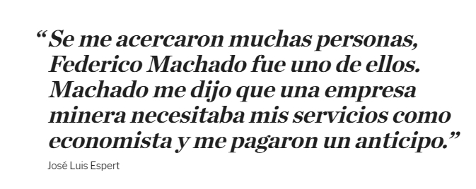 El economista agregó que la minera le anticipó 200 mil dólares, pero aclaró que nunca pudo completar el trabajo por la epidemia del Covid. Lo curioso, además del monto del adelanto, es que nunca devolvió el dinero ni al parecer nadie consideró necesario reclamárselo.