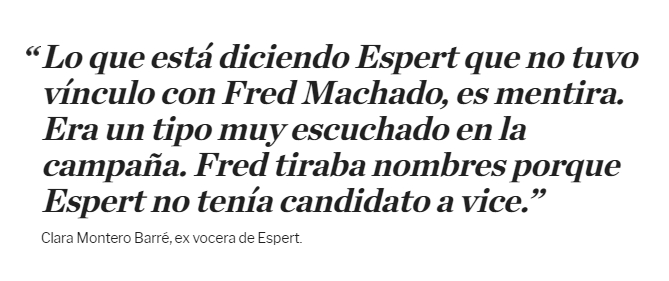 También este jueves una ex vocera de aquella campaña de Espert, reveló que Machado estaba completamente involucrado y hasta digitaba los candidatos que acompañaban al libertario. Clara Montero Barré, que fue jefa de prensa de la campaña presidencial de Espert del 2019 dijo que el libertario miente.