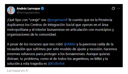 La respuesta desde La Plata fue inmediata y con tono político. El ministro de Desarrollo de la Comunidad bonaerense, Andrés "Cuervo" Larroque, salió al cruce con ironía: "¡Qué tipo con 'coraje' sos, Jorge Macri!". Pero más allá de la chicana, el funcionario rechazó de plano el planteo y lo vinculó con el contexto económico nacional.