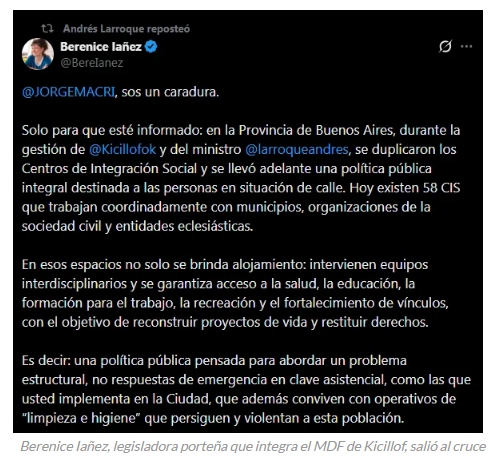 En la misma línea, la legisladora porteña Berenice Iañez —parte del armado del Movimiento Derecho al Futuro (MDF) en la Ciudad— endureció el tono: "Sos un caradura". Y agregó que en la Provincia "se llevó adelante una política pública integral destinada a las personas en situación de calle", con equipos interdisciplinarios que garantizan acceso a salud, educación, formación laboral y reconstrucción de vínculos.