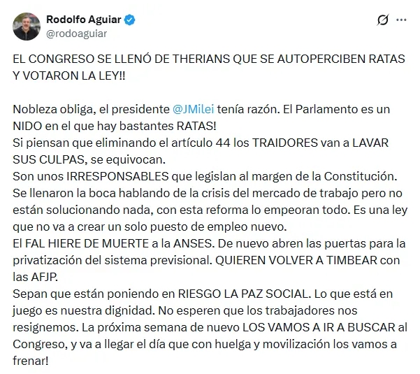 Tras la comparación, el dirigente sindical sumó otra frase que amplificó el impacto político de su mensaje. "Nobleza obliga, el presidente tenía razón. El Parlamento es un nido en el que hay bastantes ratas!", escribió, en alusión a declaraciones previas del mandatario Javier Milei.