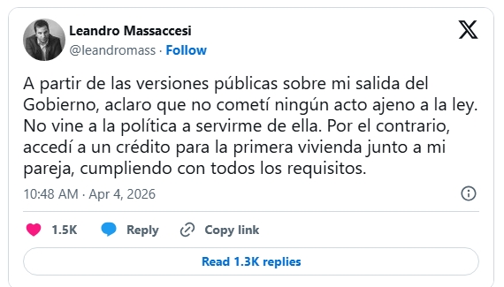 Incluso dijo que Pettovello se comunicó con periodistas para negar que hubiera echado a su jefe de gabinete, un contacto que no se vio reflejado en ningún medio. Ya era tarde: minutos después de que Pettovello lo despidiera, el propio Massaccesi había salido a dar explicaciones sobre el crédito.
