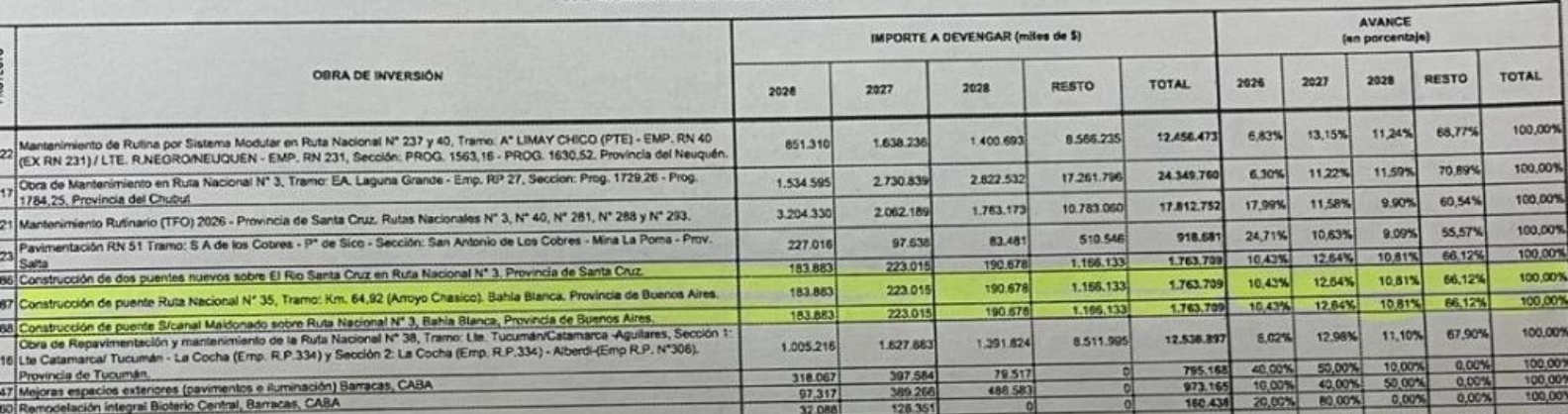Sobre esto último, resulta llamativo que las dos obras relacionadas a Bahía que figuran contempladas por la Nación tienen el mismo monto presupuestado y, además, sus ejecuciones aparecen por goteo en la proyección de los próximos años, con solo un 10% de avance para 2026.