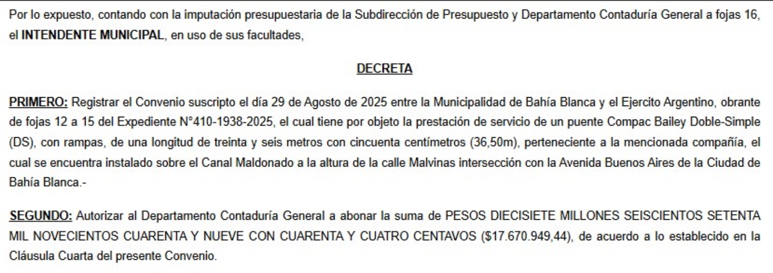 De acuerdo a los decretos 2188 y 2189 del municipio a cargo del peronista Federico Susbielles, el convenio por tres meses con opción a prórroga establece que la comuna debe pagar 17.670.949 pesos por cada puente bailey y casi 8.5 millones en concepto de seguro.