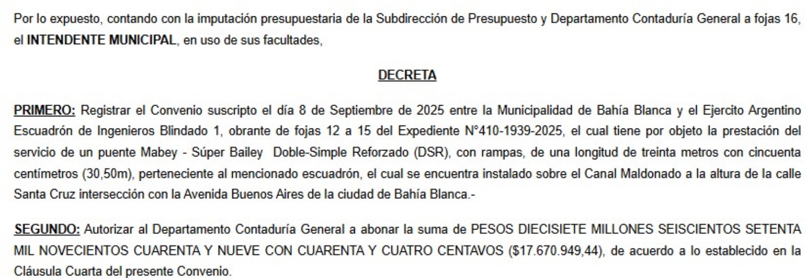 En las últimas horas, a partir de su publicación en el Boletín Oficial Municipal (ver abajo), se conocieron los convenios que el municipio bahiense firmó con el Ejército y por los cuales la comuna tiene que pagar cada tres meses una suma superior a los 43 millones de pesos por la prestación de dos puentes bailey más el seguro.