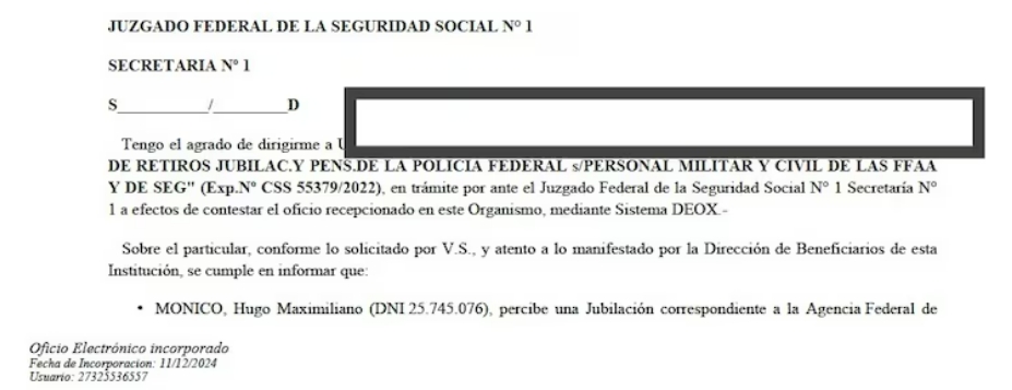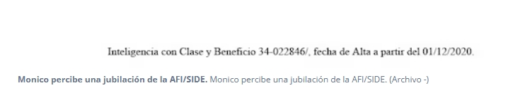 El 7 de febrero de 2024, la AFI informó en ese expediente que Monico había percibido una compensación por "trabajos extraordinarios" desde el 15 de febrero de 2002 hasta el 30 de noviembre de 2020. La Dirección de Asuntos Jurídicos (DAJ) del organismo también señaló que se le otorgó la baja el 1 de diciembre de 2020 y argumentó que ese ítem se encontraba incorporado a su jubilación. En el expediente —al que se puede acceder desde la web sin restricciones— figuran recibos de sueldo a nombre de Monico.