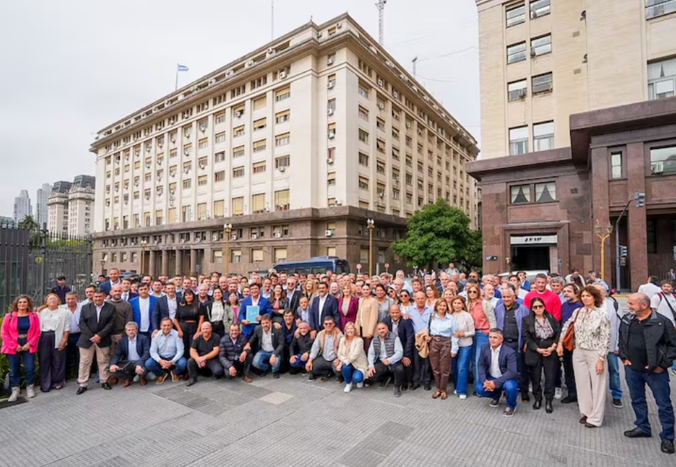 Un masivo grupo de intendentes de la provincia de Buenos Aires, pero también de varias provincias del país se hicieron presentes en la Ciudad Autónoma de Buenos Aires para reclamar al ministro de Economía, Luis Caputo, por los fondos que la Nación les recortó a las provincias -y por goteo a ellos- en materia de coparticipación, como así también por la reactivación de la obra pública y vial a partir del cobro del impuesto a los combustibles.