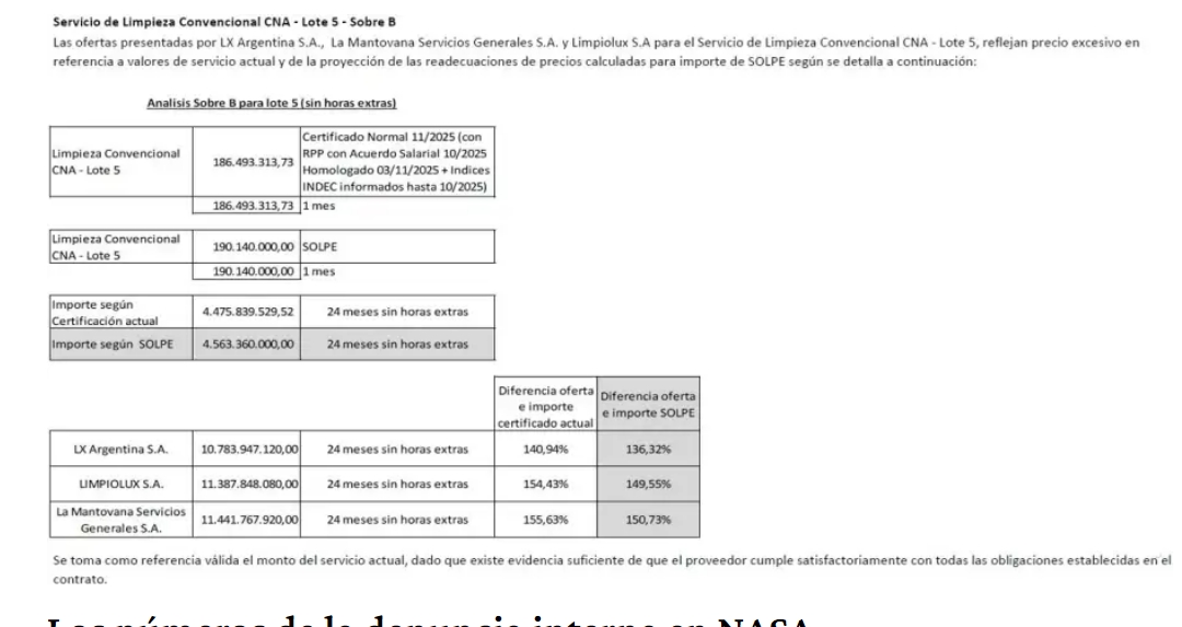 Sucede lo siguiente: según información de Nucleoeléctrica, la empresa que en la actualidad presta el servicio de limpieza en discusión (Claryty) cobró $4.475.839.529 por 24 meses sin horas extra. La cifra es similar al precio de referencia estimado por la propia NASA, que es de $4.563.360.000. Aún así, las tres firmas que intentaron tomar el trabajo ofrecieron montos llamativamente altos: La Mantovana ofertó $11.441.767.920; Limpiolux, $11.387.848.080; y LX Argentina, $10.783.947.120.