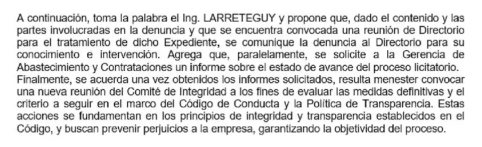 Estos no son los únicos problemas que sacudieron a la empresa en el último tiempo. En la denuncia de Nolasco Sáenz se menciona una reunión en la que se abordó el estado de los sumarios administrativos contra los trabajadores Martín Reina y Gabriel Blejer. Según la presentación, las autoridades informaron que "ambos quedarían exentos de culpa y cargo".