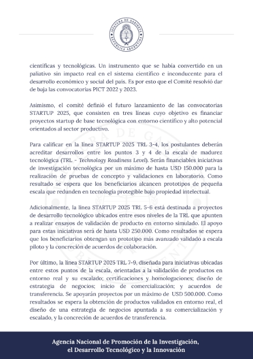 "Esta línea renueva y optimiza la convocatoria de Proyectos de Investigación Científica y Tecnológica (PICT) poniendo fin a un modelo que diluía los recursos en una multiplicidad de proyectos a los que se les adjudicaban montos que resultaban insuficientes para el desarrollo de iniciativas científicas y tecnológicas. Un instrumento que se había convertido en un paliativo sin impacto real en el sistema científico e inconducente para el desarrollo económico y social del país. Es por esto que el Comité resolvió dar de baja las convocatorias PICT 2022 y 2023", dice el comunicado oficial de la Agencia, que depende de Jefatura de Gabinete.