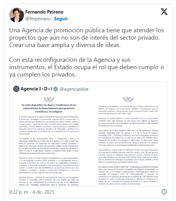 "Una Agencia de promoción pública tiene que atender los proyectos que aún no son de interés del sector privado. Crear una base amplia y diversa de ideas. Con esta reconfiguración de la Agencia y sus instrumentos, el Estado ocupa el rol que deben cumplir o ya cumplen los privados", advirtió desde su cuenta de X Fernando Peirano, al frente de la entidad entre 2019 y 2023.