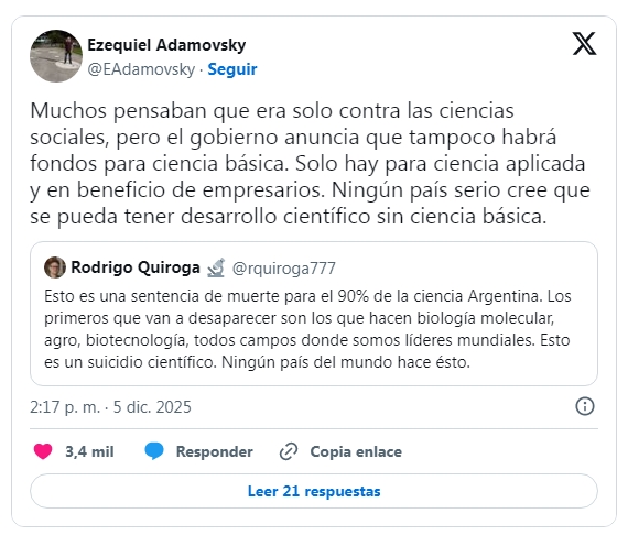 "Distintos gobiernos podrían dentro de la ciencia básica querer beneficiar unas áreas y no otras, eso es entendible, pero en este caso se deja de financiar toda la investigación en todas las áreas". Las consecuencias son difíciles de dimensionar: "No se va a generar el conocimiento nuevo que es necesario para aplicar de acá a una década o más".