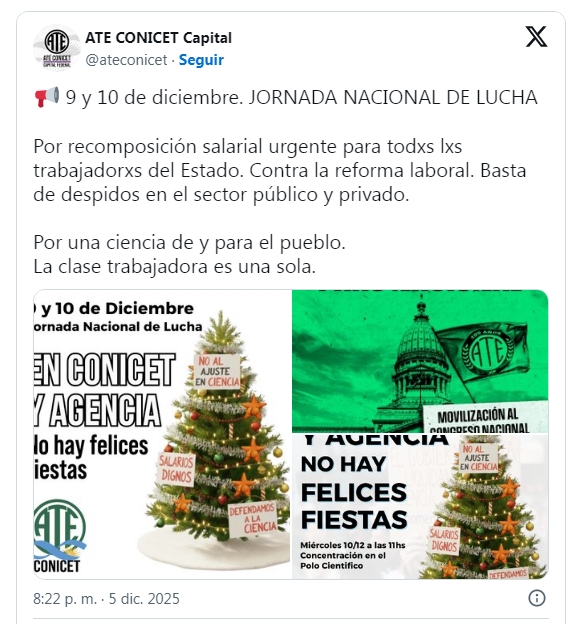 Mientras crece el repudio ante la confirmación del cientificidio planificado, se convoca a una jornada nacional de lucha el martes 9 y miércoles 10, con concentración en el Polo Científico el 10 a las 11. El lema: "En Conicet y Agencia no hay felices fiestas".