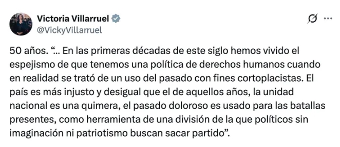 Con esa definición, Villarruel volvió a marcar distancia del enfoque impulsado durante los años kirchneristas en torno a la memoria sobre los años 70. En su mensaje, sostuvo que el abordaje estatal sobre ese período fue parcial y cuestionó que, lejos de contribuir a cerrar heridas, haya servido para profundizar divisiones políticas y sociales.