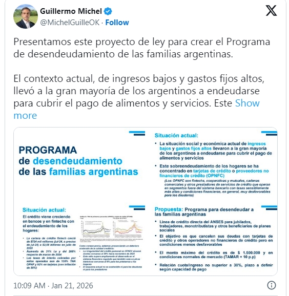 El massista Michel estuvo entre los que impulsaron la propuesta, que recoge puntos en común con iniciativas que otros legisladores ya venían trabajando por separado. "El contexto actual, de ingresos bajos y gastos fijos altos, llevó a la gran mayoría de los argentinos a endeudarse para cubrir el pago de alimentos y servicios", explicó el diputado entrerriano. Ese endeudamiento familiar suele darse a tasas muy altas, a través de tarjetas de crédito, aplicaciones financieras, cooperativas, mutuales y cadenas comerciales. Frente a ese escenario, el proyecto propone reconvertir esas deudas en líneas de crédito directas de la Anses, destinadas a jubilados, trabajadores, monotributistas y beneficiarios de planes sociales, con condiciones mucho menos desfavorables.