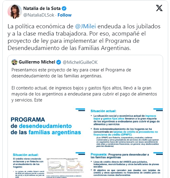 A tono con los nuevos tiempos, los diputados destacaron que el proyecto "cuida el superávit", ya que resultaría rentable para la Anses -que prestaría a tasas de mercado- y, al mismo tiempo, protege el bolsillo de las familias argentinas, que pasarían de préstamos impagables a otros con condiciones razonables. "La política económica de Milei endeuda a los jubilados y a la clase trabajadora", explicó Natalia de la Sota su firma al proyecto para implementar un Programa de Desendeudamiento de las Familias Argentinas. De la Sota conformó el monobloque Defendamos Córdoba, en el que mantiene un juego independiente, aunque con cercanía al massismo.