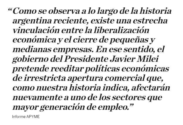 "Como se observa a lo largo de la historia argentina reciente, existe una estrecha vinculación entre la liberalización económica y el cierre de pequeñas y medianas empresas. En ese sentido, el gobierno del Presidente Javier Milei pretende reeditar políticas económicas de irrestricta apertura comercial que, como nuestra historia indica, afectarán nuevamente a uno de los sectores que mayor generación de empleo", concluye el trabajo.