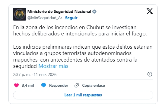 Lo expuesto por el jefe policial de algún modo contradice la acusación del Ministerio de Seguridad, que en un tuit informó que los incendios "estarían vinculados a grupos terroristas autodenominados mapuches, con antecedentes de atentados contra la seguridad pública y la propiedad privada, bajo la modalidad de terrorismo ambiental".