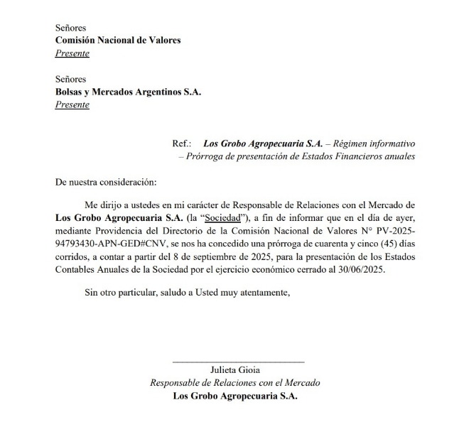 Además, recientemente se conoció que la Comisión Nacional de Valores (CNV) concedió una prórroga de 45 días a partir del 8 de septiembre para la presentación de los Estados Contables Anuales de la Sociedad por el ejercicio económico cerrado al 30 de junio de 2025. La información fue comunicada por Julieta Gioia, Responsable de Relaciones con el Mercado de la firma, según se verifica en el sitio del ente que regula el mercado de capitales.